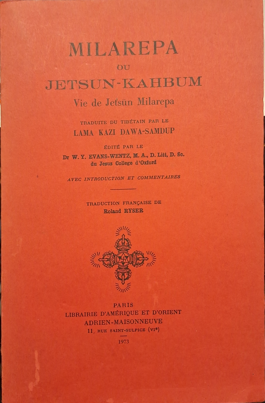 Paris, Adrien-Maisonneuve, 1973, in-8, broché, 363 pp., frontispice et illustrations hors-texte en noir. Traduite du tibétain par le lama Kazi Dawa-Samdup. Édité par Evans-Wentz du Jesus College d’Oxford avec introduction et commentaires. Traduction française de Roland Ryser.